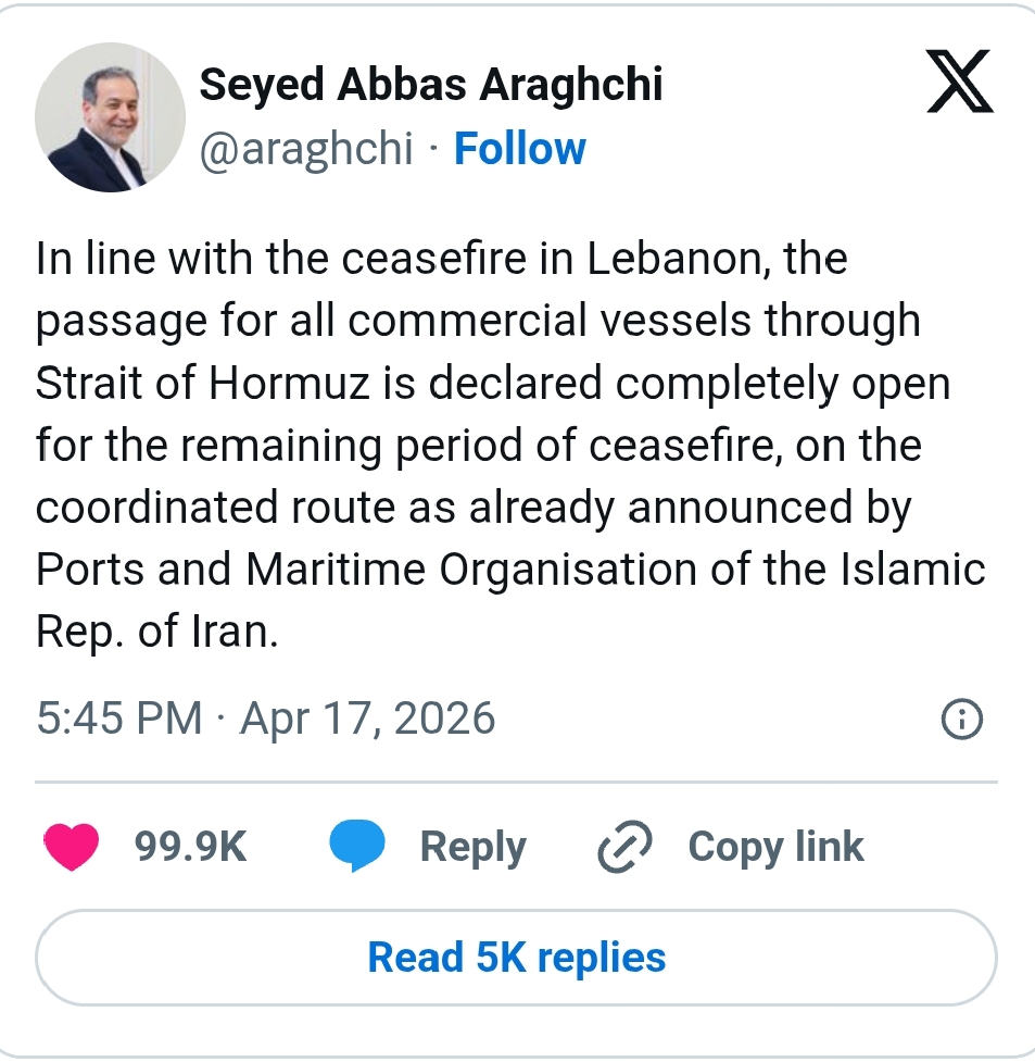 Iran’s Foreign Minister, Abbas Araqchi, took to social media platform X (formerly Twitter) to confirm the decision, stating that the Strait of Hormuz is now open to all commercial vessels. He emphasized that the route would remain fully operational throughout the duration of the ceasefire in Lebanon.